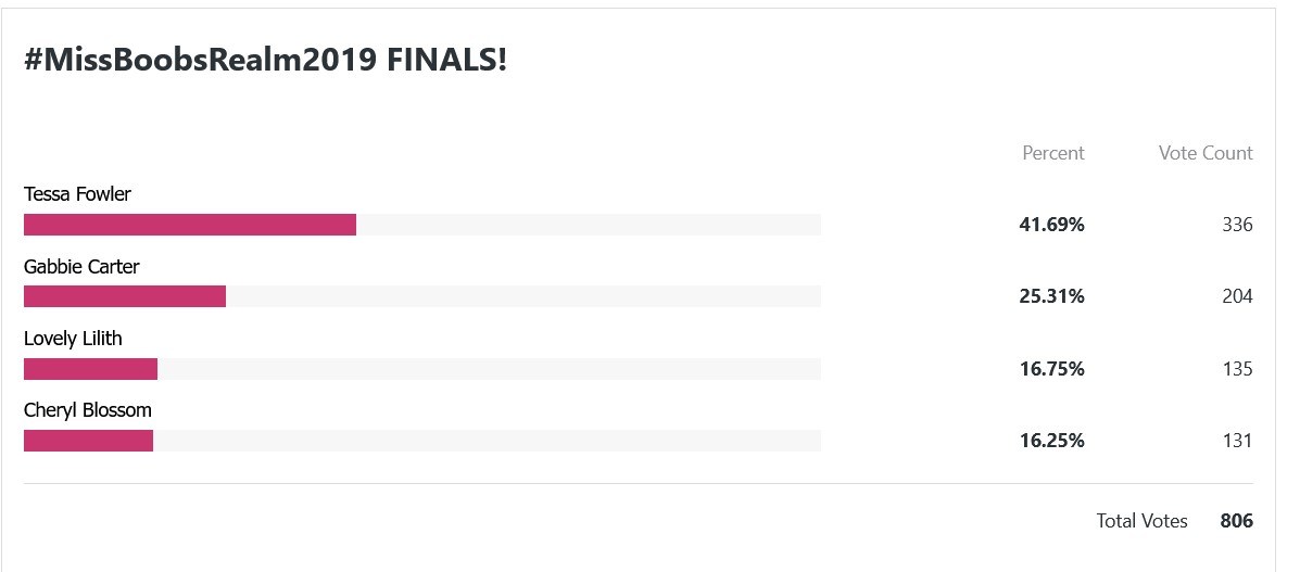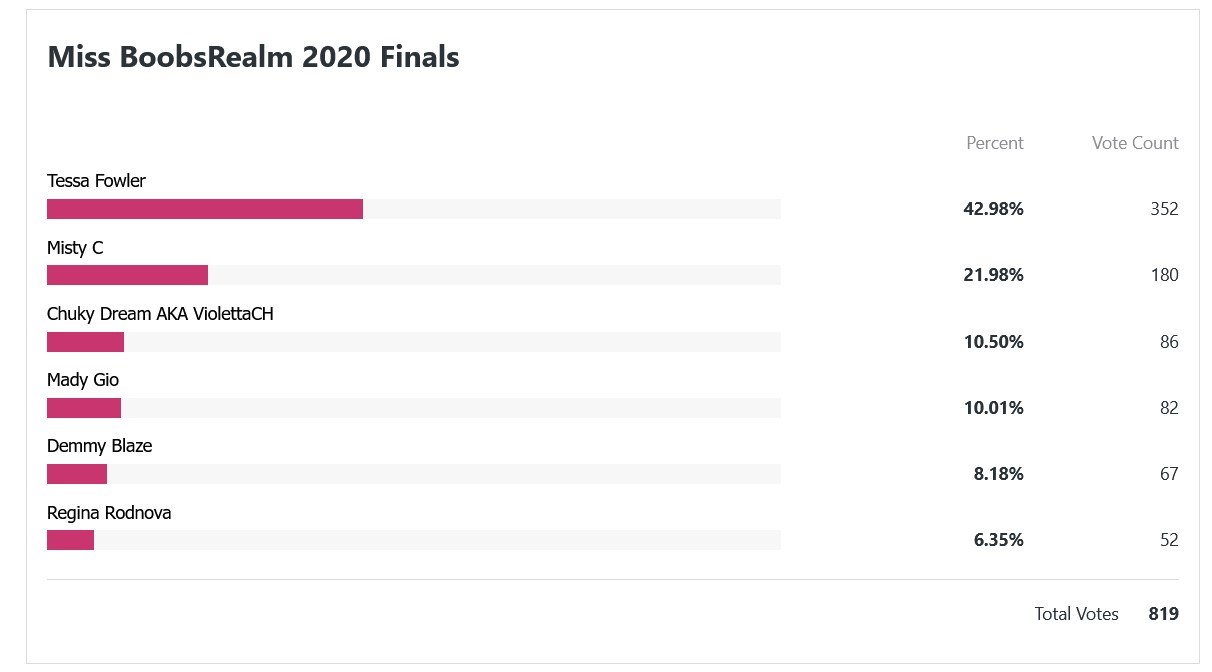 I have really came to the conclusion Tessa fans have helped her win at least one of her wins in 2018, 2019 and 2020. However I do think maybe 2 of them may be legit ins anyway. However, Tessa fans can be annoying and obsessed. I had 2 of them bragging to have used VPN to vote for Tessa. They are everywhere. I have nto seen that for Sarah Bustani or Busty Ema, who still get more votes that I would expect, but at least their fans are vocal about them being popular, but are not going out of their way just to shove them our throats.